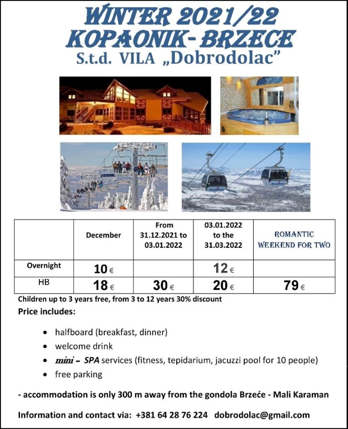 We offer double, triple and quadruple rooms with a total capacity of up to 60 beds. Dobrodolac Resort has a restaurant – closed type (for its guests) as well as a coffee and SPA club.